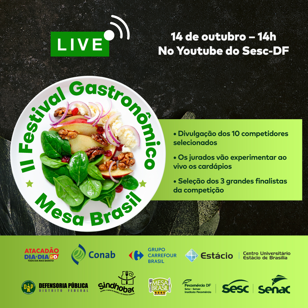​​​​Para incentivar cada vez mais pessoas a adotarem a alimentação inclusiva e como forma de celebrar o Dia Mundial da Alimentação (comemorado em 16 de outubro), o Mesa Brasil Sesc do Distrito Federal realizará nesta quinta (14) e sexta feira (15), às 14h, com transmissão ao vivo no Youtube do Sesc-DF - CLIQUE AQUI​, o II Festival Gastronômico online com receitas a partir do reaproveitamento dos alimentos ou aproveitamento integral dos alimentos. As 10 instituições selecionadas vão preparar uma receita que terá de ser obrigatoriamente um prato principal vegetariano, composto de saladas ou vegetais cozidos, guarnição e acompanhamentos.